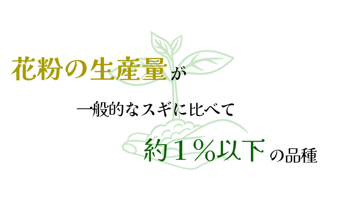 少花粉スギ品種は、花粉量が従来のスギの1%未満となっています。実生(みしょう)とは、種子から発芽させ苗木を育てます。さし木とは、母株の枝を土に挿し発根を促し苗木を育てる方法で、優良品種の純系の保存の手段です。